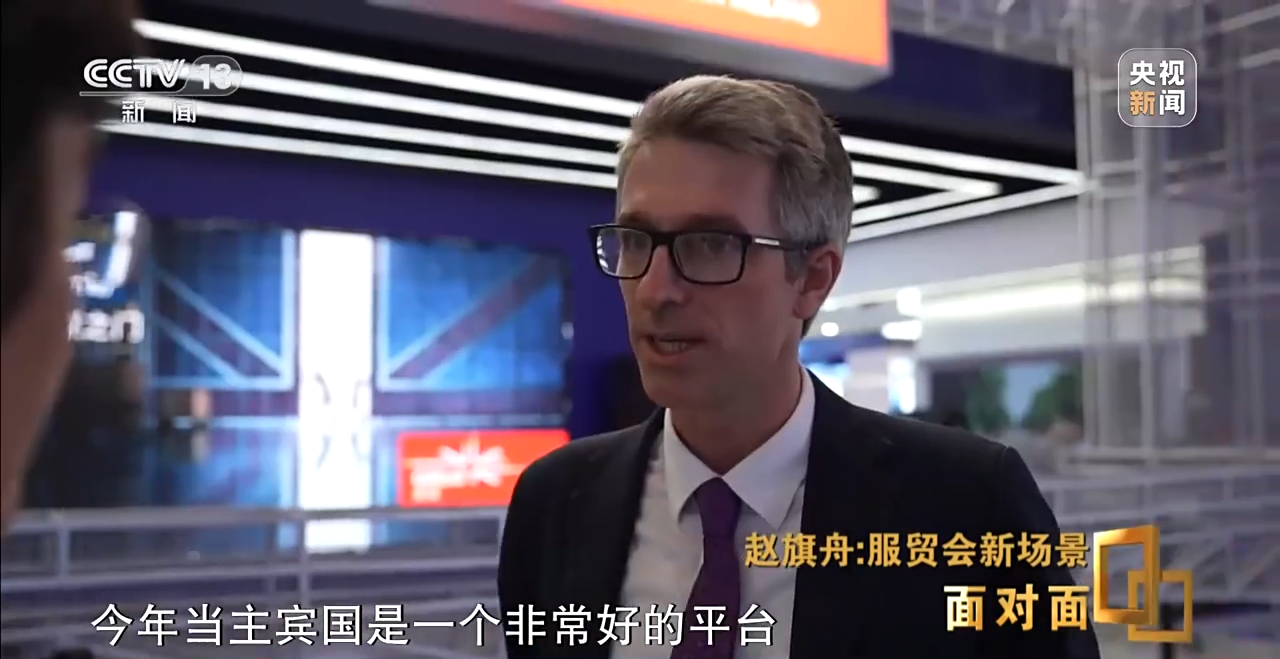 英国驻华贸易使节 杜涛:今年当主宾国是一个非常好的平台,我们服务贸易的合作加强一点,可以获得新的一些商业成果。英国是一个服务贸易大国,比较好的一些服务可以提供给中国合作伙伴。比如说金融行业、医疗服务,包括环境的一些服务和产品都有,参加服贸会的中国企业也很多,比较优秀的企业也很多,非常欢迎到我们英国馆。
