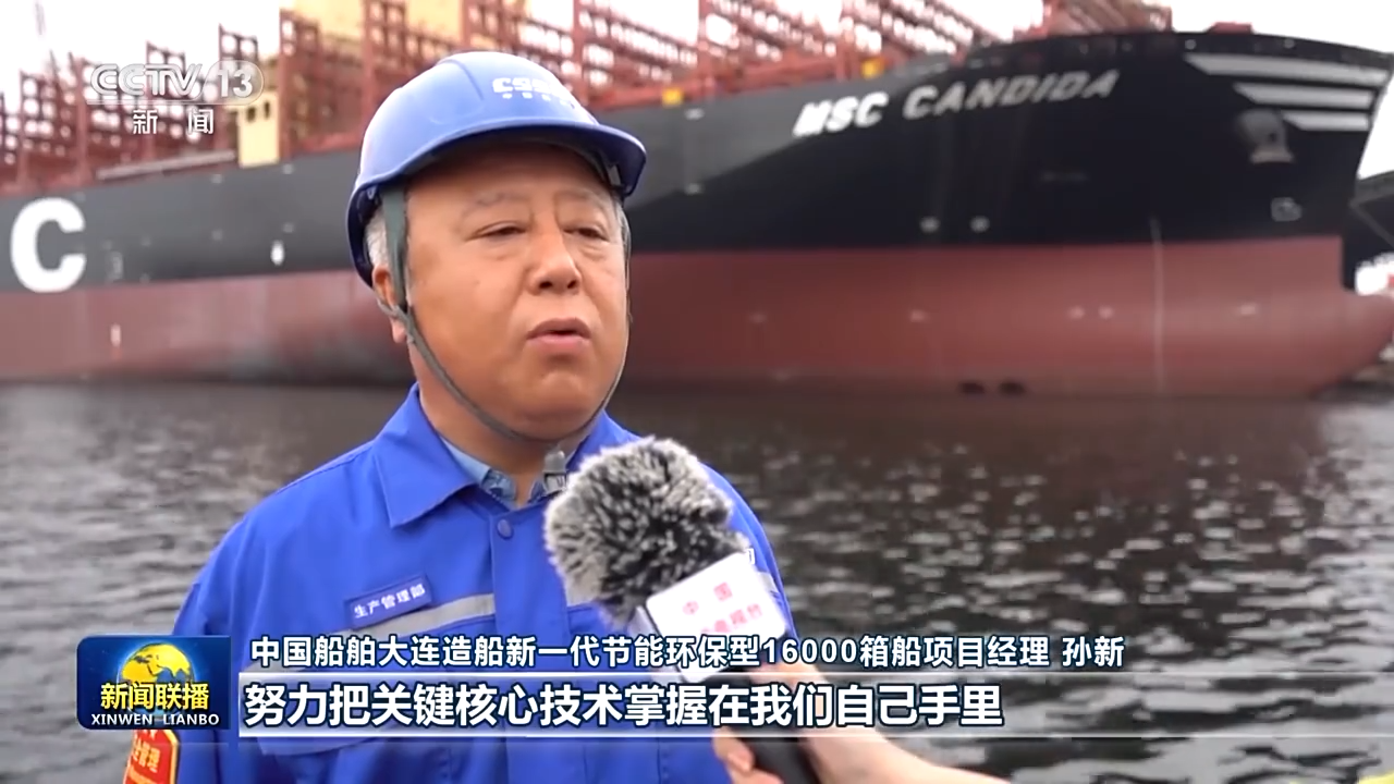 中国船舶大连造船新一代节能环保型16000箱船项目经理 孙新:我们备受鼓舞,深感责任重大,我们将继续加快科技研发和成果转化步伐,努力把关键核心技术掌握在我们自己手里,提高企业核心竞争力,强化战略支撑作用,为推动东北全面振兴海洋经济高质量发展作出更大贡献。