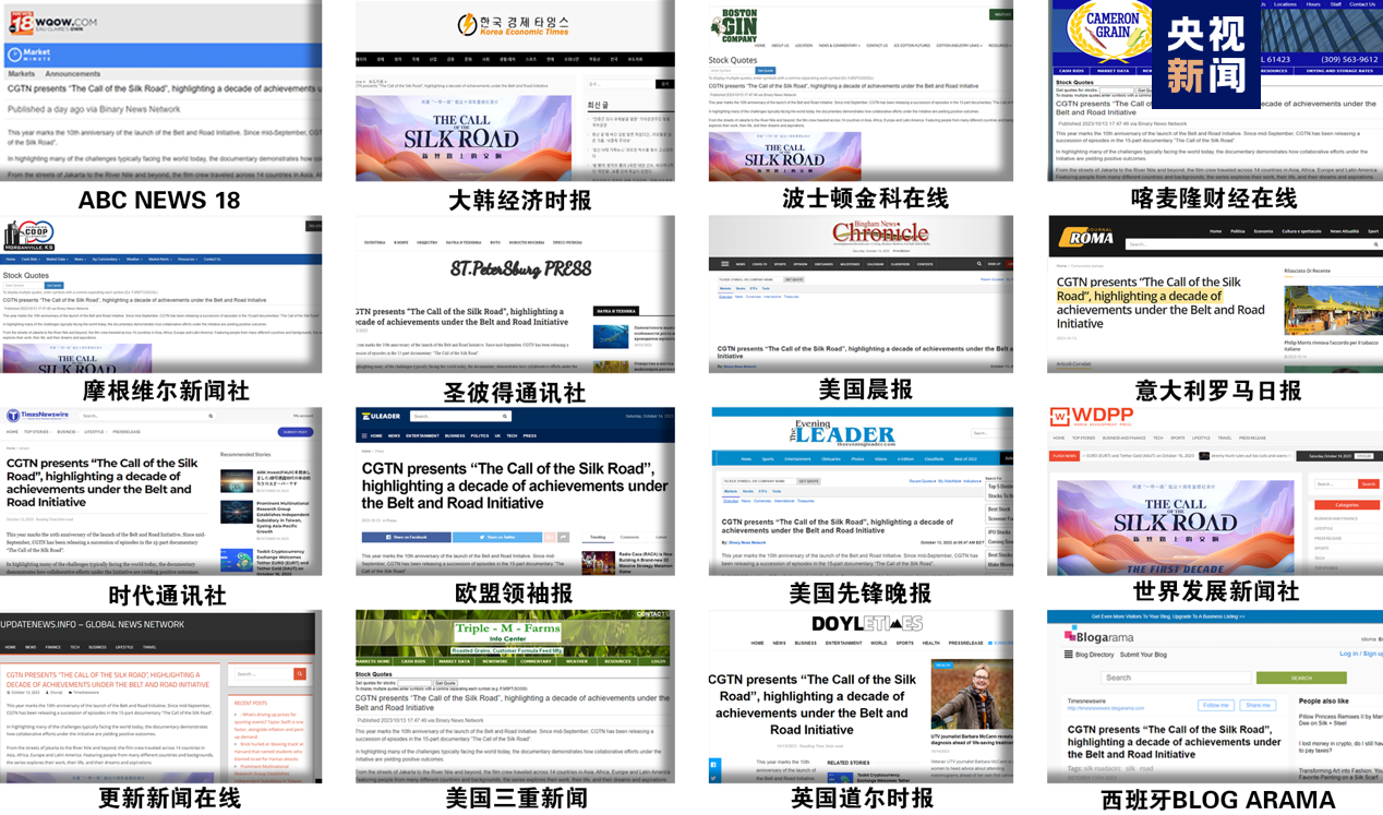 总台CGTN多语种全平台发布的相关内容得到了国际主流媒体的广泛转载转引。官网特稿获得来自美国、英国、加拿大、印度、德国、意大利等20个国家和地区的818家海外主流网络媒体转载。代表媒体有ABC18新闻频道子站、12频道、波士顿金科在线、喀麦隆财经在线、摩根维尔新闻社、世界发展新闻社、更新新闻在线、欧盟领袖报、时代通讯社、西班牙ARAMA、美国晨报、美国先锋晚报、加拿大彼得森农业资讯、加拿大斯通尼布鲁克电力资讯、韩国大邱日报、大韩经济时报、日本DYP东瀛通讯社、法国路易通讯社、埃菲尔邮报、德国法兰克福城市公报、德国慕尼黑新报、英国道尔时报、意大利金融报、意大利罗马日报等,触达潜在海外受众超过4亿人次。