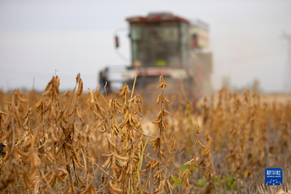 10月19日,在山东省东营市广饶县李鹊镇西张庄村玉米大豆带状复合种植田里,农民驾驶收割机收获大豆。