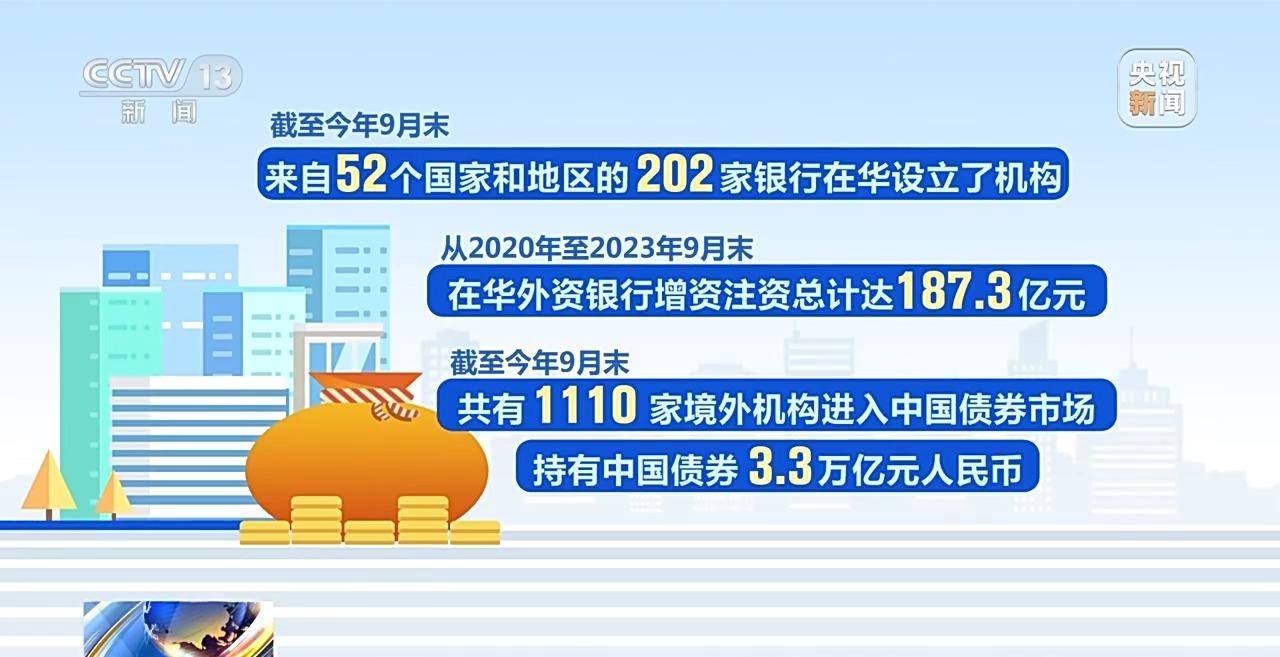 金融开放步伐加快。截至今年9月末,来自52个国家和地区的202家银行在华设立了机构;从2020年至2023年9月末,在华外资银行增资注资总计达187.3亿元。截至今年9月末,共有1110家境外机构进入中国债券市场,持有中国债券3.3万亿元人民币。