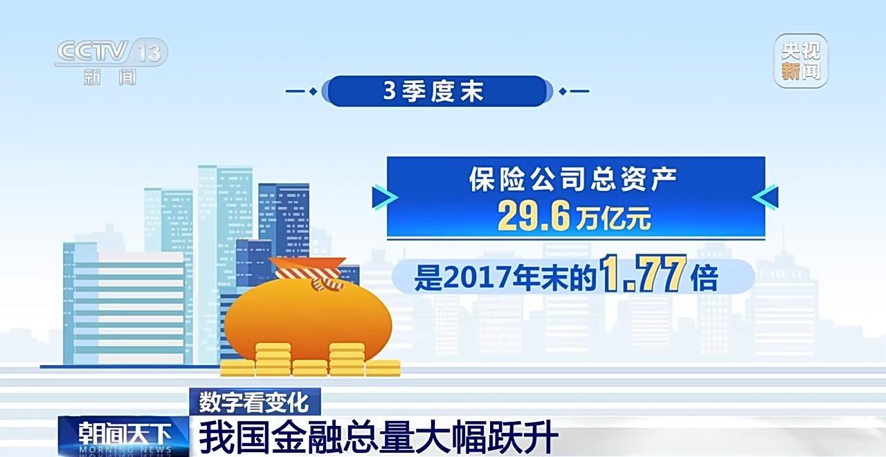 保险方面,3季度末,保险公司总资产29.6万亿元,是2017年末的1.77倍。从2018年到今年3季度末,保险公司赔款与给付累计支出8.4万亿元,保险的保障功能日益突出。