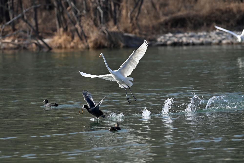 在山西省太原市,鸟儿在汾河嬉戏(2023年1月4日摄)。新华社记者 杨晨光 摄