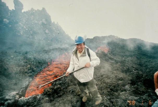 △1998年1月,刘嘉麒在留尼汪岛富尔奈斯火山测量正在喷出的岩浆温度。