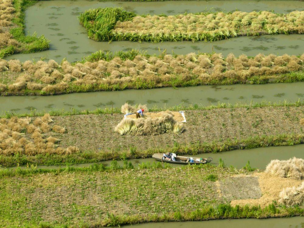 5月28日,农民在兴化市千垛景区采收油菜籽(无人机照片)。新华社发(周社根摄)