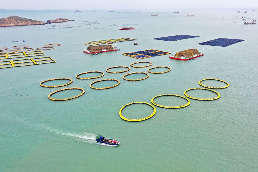 10月10日,福建省连江县定海湾内渔船经过深水网箱、渔排及深远海养殖平台(无人机照片)。新华社记者姜克红摄