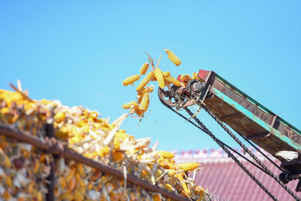 10月19日,在吉林省公主岭市友忠种植农民专业合作社,农民将收获的玉米放入科学储粮仓。新华社记者 张楠 摄