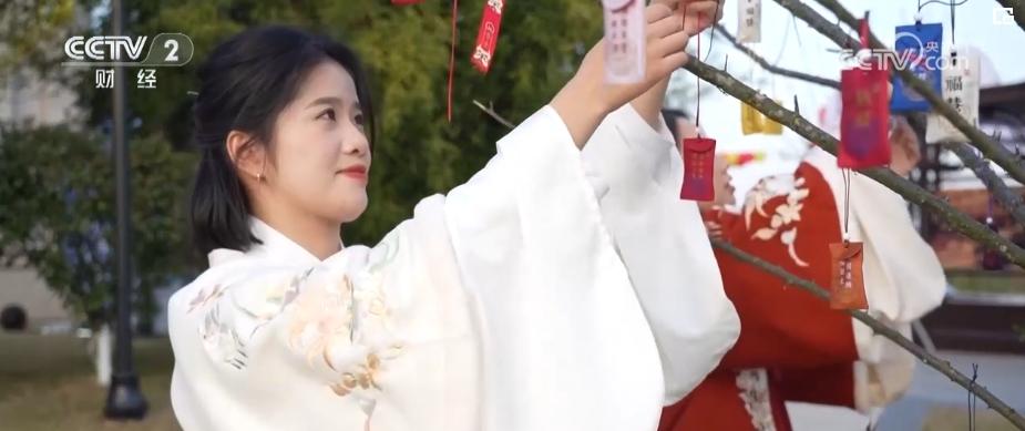 在江西共青城,树上也高高挂着灯笼,营造出火树银花的效果。步行街区两个入口处分别搭建彩灯装饰物,当地还策划了汉服体验、围炉煮茶、惊喜派送、篝火晚会等精彩活动,庆祝新年到来。