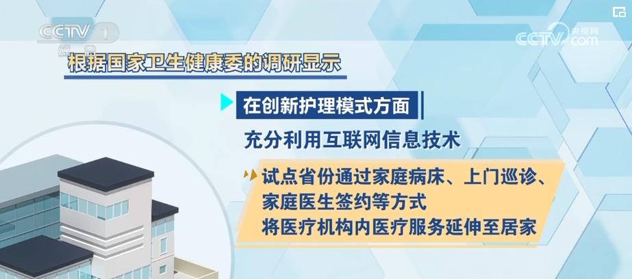 在创新护理模式方面,充分利用互联网信息技术,试点省份通过家庭病床、上门巡诊、家庭医生签约等方式,将医疗机构内医疗服务延伸至居家。目前,共计有3000多个医疗机构,可以上门为居家老年人提供7大类60多项医疗护理服务项目,减轻了患者和家属的负担。
