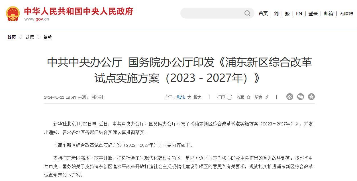 近日,中共中央办公厅、国务院办公厅印发了《浦东新区综合改革试点实施方案(2023-2027年)》。