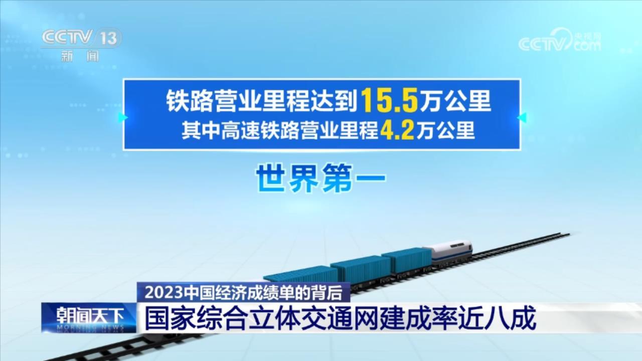 铁路营业里程达15.5万公里,其中,高速铁路营业里程4.2万公里,居世界第一;公路通车里程535.5万公里,其中,高速公路建成里程17.7万公里,也居世界第一。