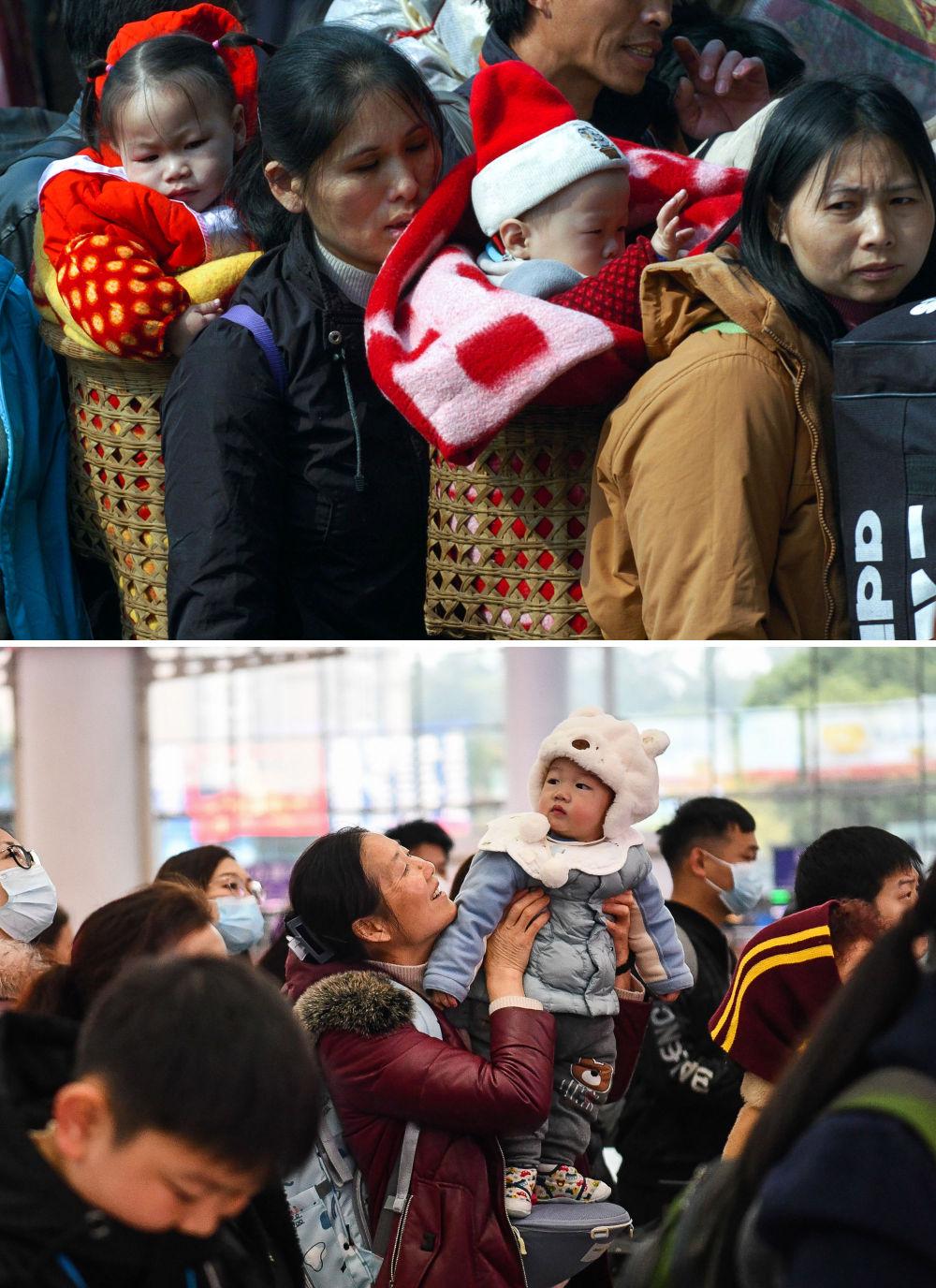 上图:2005年1月17日,两名背着孩子的旅客在广州火车站排队等待检票进站。新华社记者 刘大伟 摄