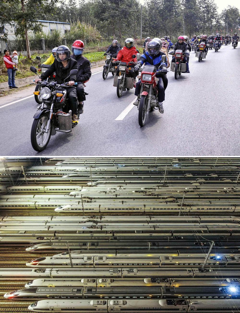 上图:2013年1月30日,回家过年的摩托返乡大军行驶在321国道广东封开段。新华社记者 梁旭 摄