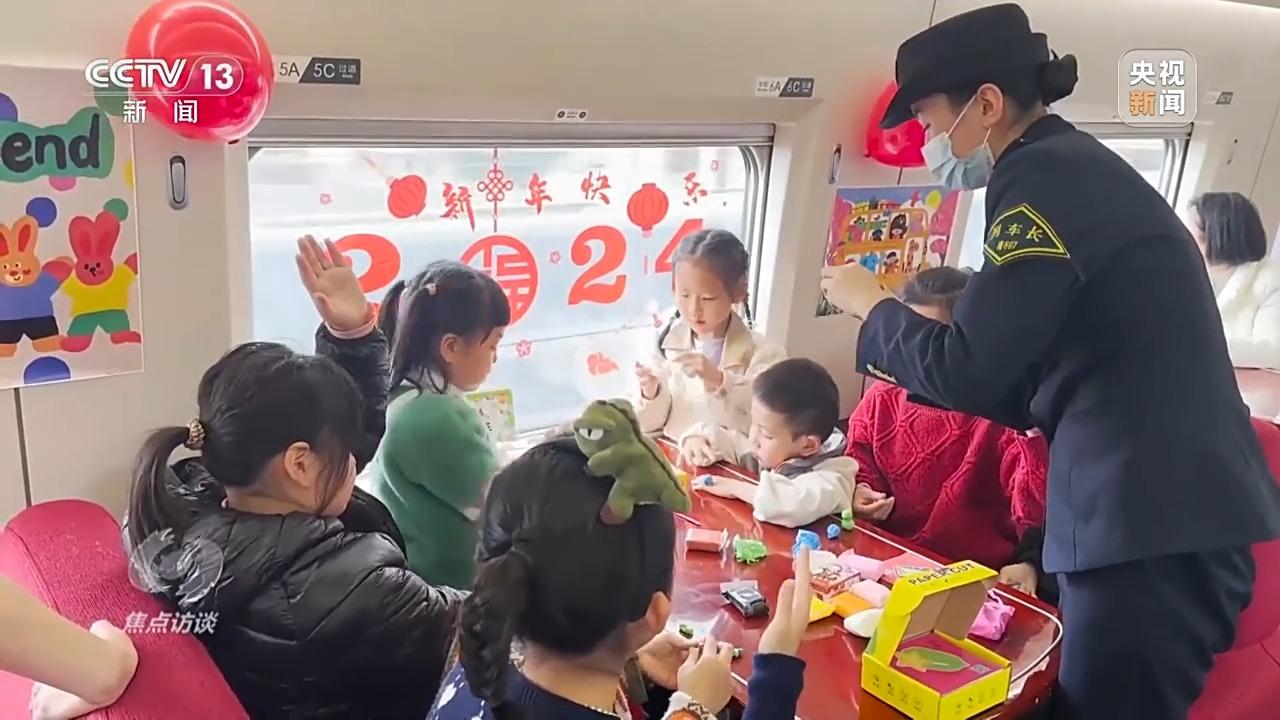 不仅要让旅客顺利回家,还要让回家路更舒适。在厦门开往上海的G1654次高铁列车上,一群小旅客在乘务员的带领下玩着小游戏。今年春运期间,这趟列车的餐车部分区域被临时改造成了“遛娃舱”,这方便的可不仅是孩子和家长。