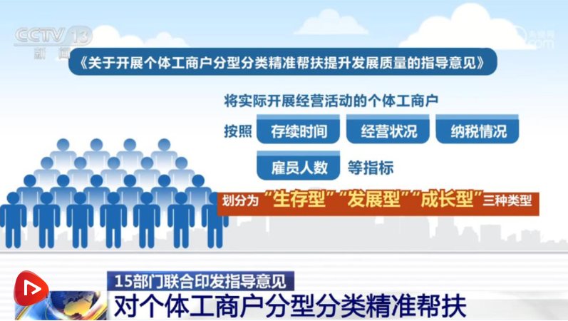 《指导意见》提出,将实际开展经营活动的个体工商户按照存续时间、经营状况、纳税情况、雇员人数等指标,划分为“生存型”“发展型”“成长型”三种类型,实施针对性扶持举措。
