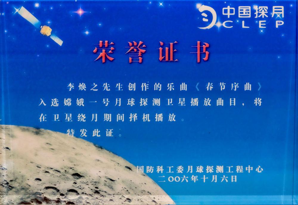 《春节序曲》入选嫦娥一号月球探测卫星播放曲目荣誉证书。李大康供图
