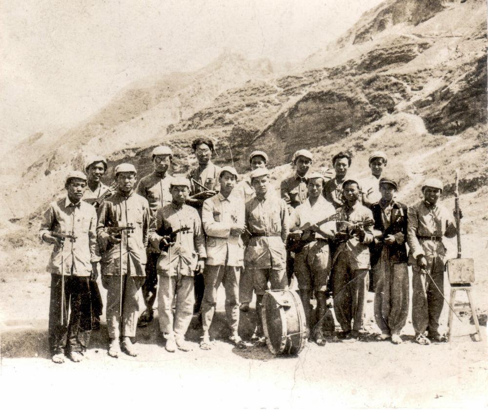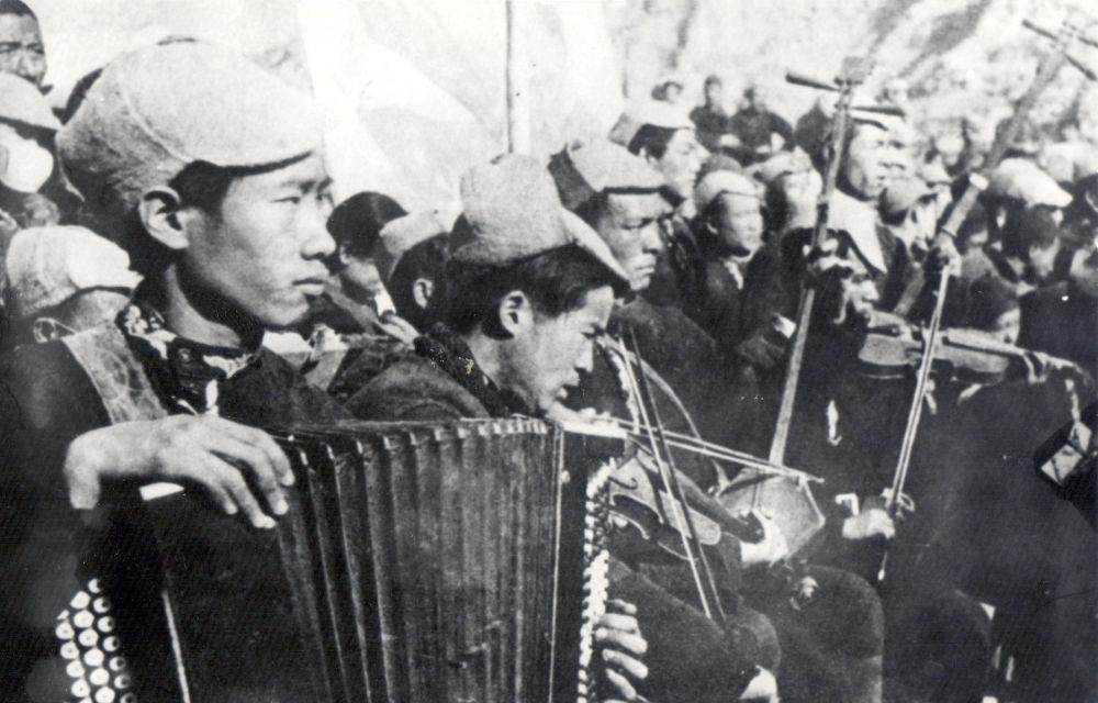 1943年春节期间李焕之作为乐队成员,跟随鲁艺秧歌队在延安演出,左一为李焕之。延安文艺纪念馆供图