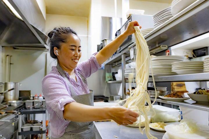 澳大利亚堪培拉“东北农家小院”餐馆的经营者孟繁华在做手工面条。新华社发(储晨摄)