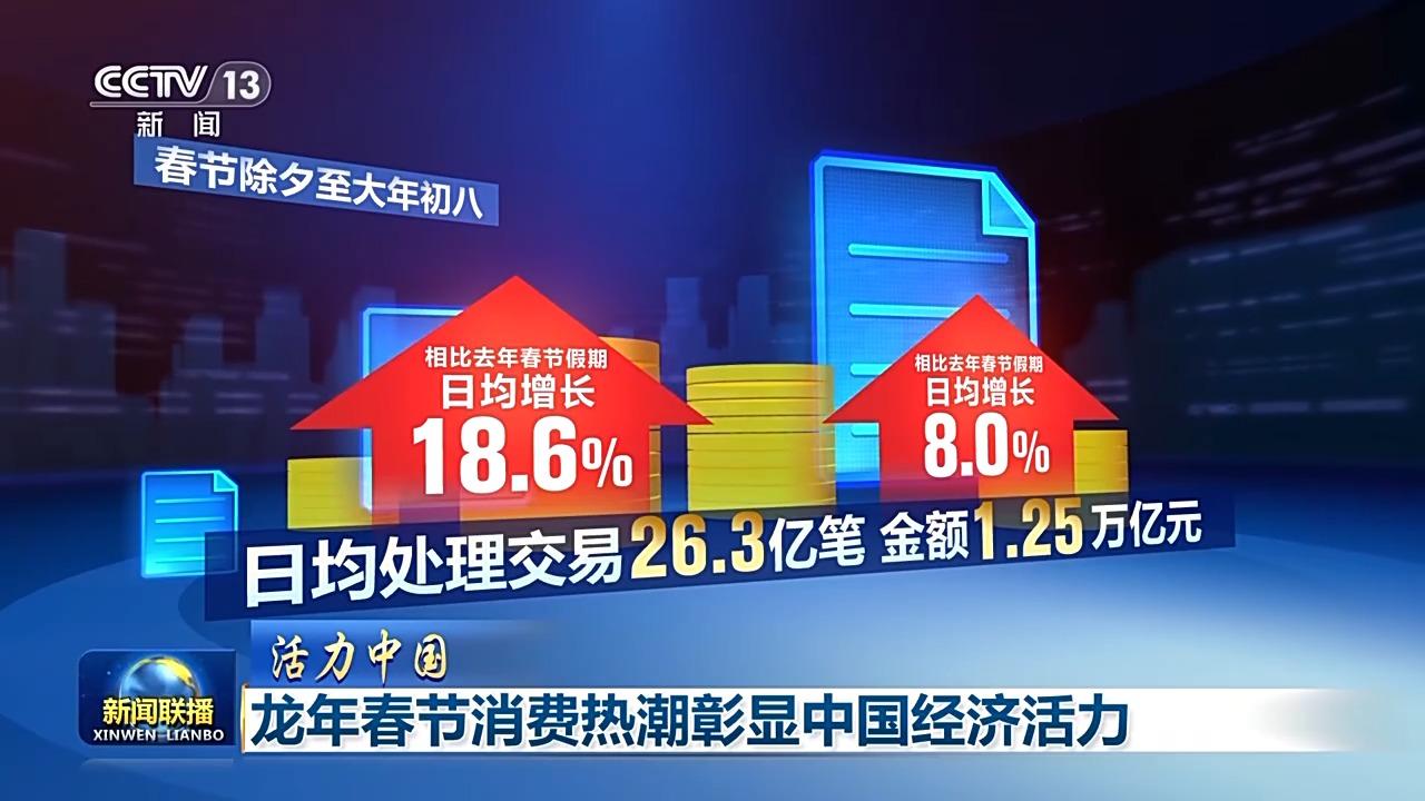 红火的龙年春节,折射出中国超大规模内需市场潜力,也进一步激发中国经济向好的动力。国家税务总局增值税发票数据显示,今年春节假期,全国服务消费相关行业日均销售收入同比增长52.3%,消费,正持续发挥拉动经济增长的主引擎作用。