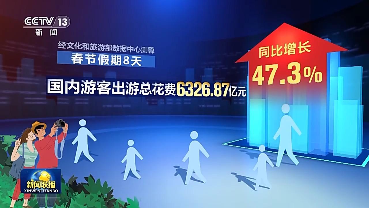 今年这个春节,人们走得更远,游玩时间更长。出行平台分析订单数据后发现,假期里,超过一半的人选择跨省出游,其中三成以上的人选择两个及以上目的地,中国游客出境目的地覆盖全球1700多个城市,个性化出游、定制化消费成为新趋势。在陕西景区里看一场沉浸式演出,游客既是观众,又是演员,全新消费体验带来上亿元演出收入;四川把火锅文化和特色观光结合在一起,带动特色餐饮消费热度不断。节日里,滕王阁景区北园向公众开放,通过滨江水道,游客可以直接穿行老城区的商铺。经文化和旅游部数据中心测算,春节假期八天,全国国内旅游出游4.74亿人次,同比增长34.3%,国内游客出游总花费6326.87亿元,同比增长47.3%。