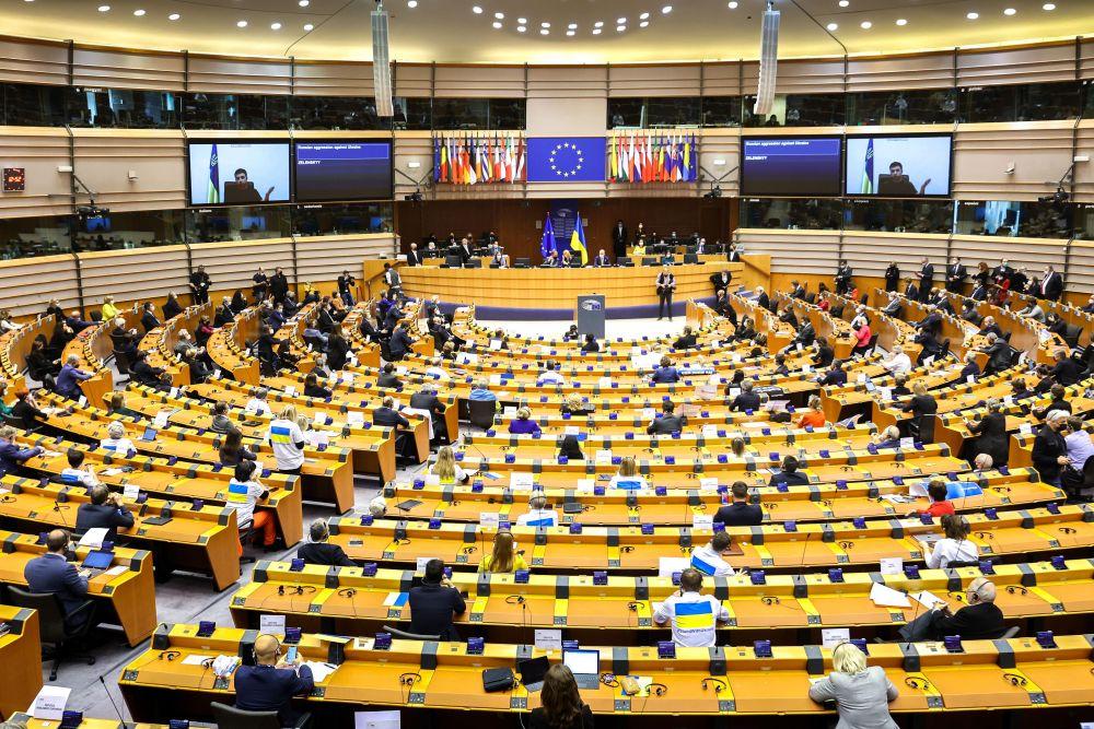 2022年3月1日,在比利时布鲁塞尔举行的欧洲议会全会上,乌克兰总统泽连斯基远程发表演讲。新华社发(欧盟供图)