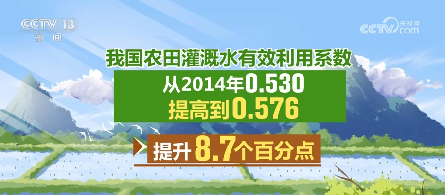 0.576,这是目前我国农田灌溉水有效利用系数。通过持续推进大中型灌区续建配套与现代化改造,不断完善灌排工程体系和农业用水计量设施,强化农业节水管理等,我国农田灌溉水有效利用系数已从2014年的0.530提高到0.576,提升了8.7个百分点。