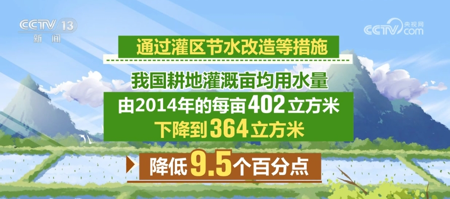 364立方米,这是目前我国耕地灌溉亩均用水量,通过灌区节水改造等措施,我国耕地灌溉亩均用水量由2014年的每亩402立方米下降到364立方米,降低了9.5个百分点。