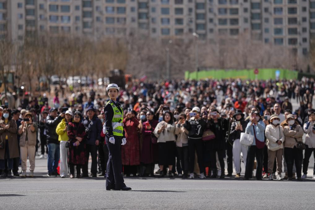 许多游客争相与女骑警合影留念