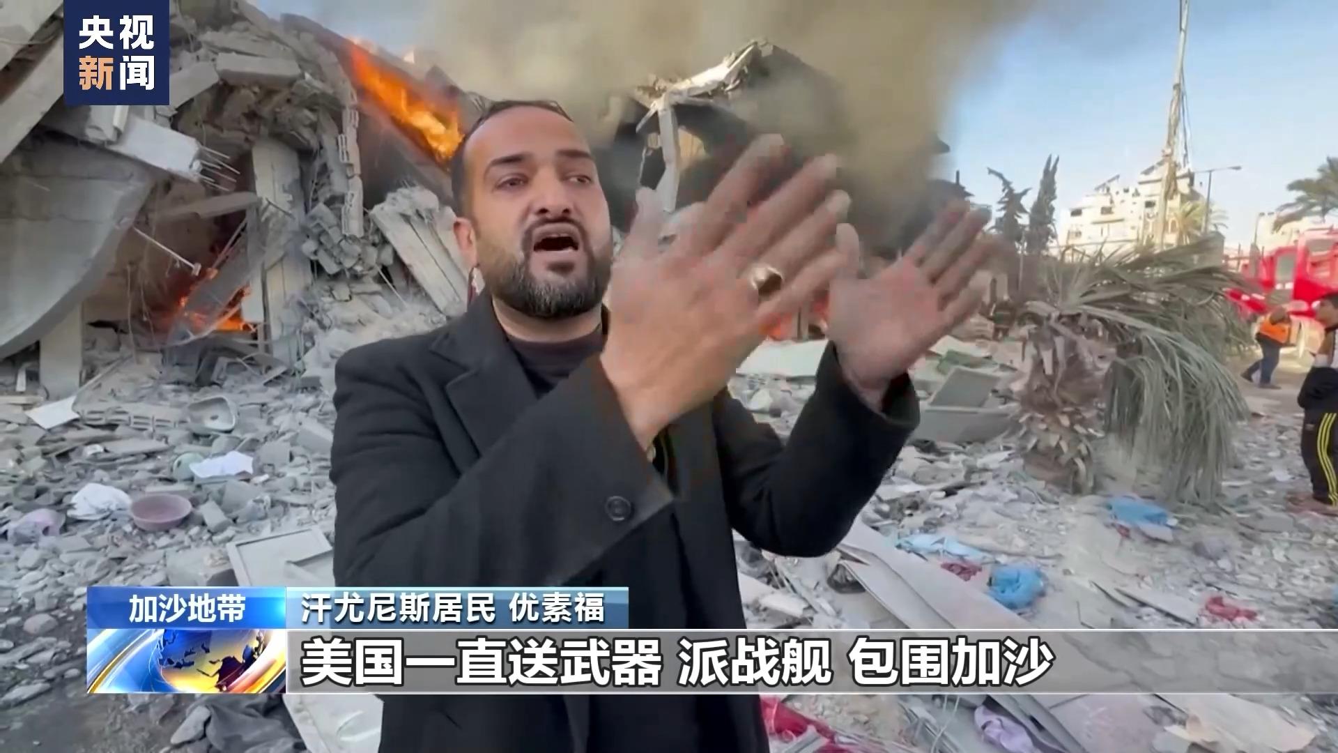 汗尤尼斯居民 优素福:美国一直送武器、派战舰,包围加沙,用来轰炸加沙的武器和导弹,都是美国和西方国家制造的。