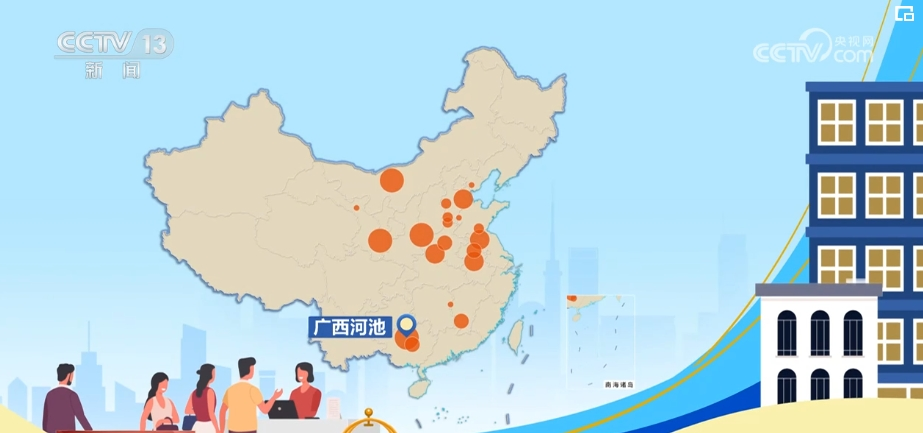 大家都去哪儿了?通过分析平台上335个目的地的同比增幅数据后,找到了2024年“五一”最受欢迎的小众旅游目的地。在这张热力图上,标注的是增幅前20的小众目的地城市,圆圈大小表示增幅的高低,排名第一的广西河池的酒店和票务预订同比增长近四倍,而分布在10个不同省份的这20个城市,同比增幅都在一倍以上。