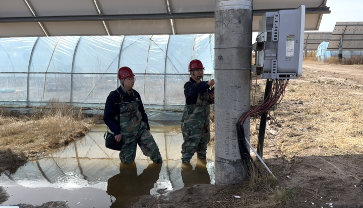 吉林省大安市同瑞新平安光伏电站站长李建平正带领站内成员对光伏发电设备进行巡查巡视。新华社记者 司晓帅摄