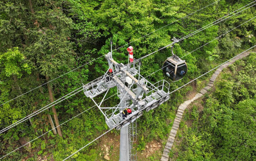 5月1日,在湖南张家界国家森林公园天子山,索道工作人员在支架上巡检设备(无人机照片)。 新华社发(吴勇兵摄)