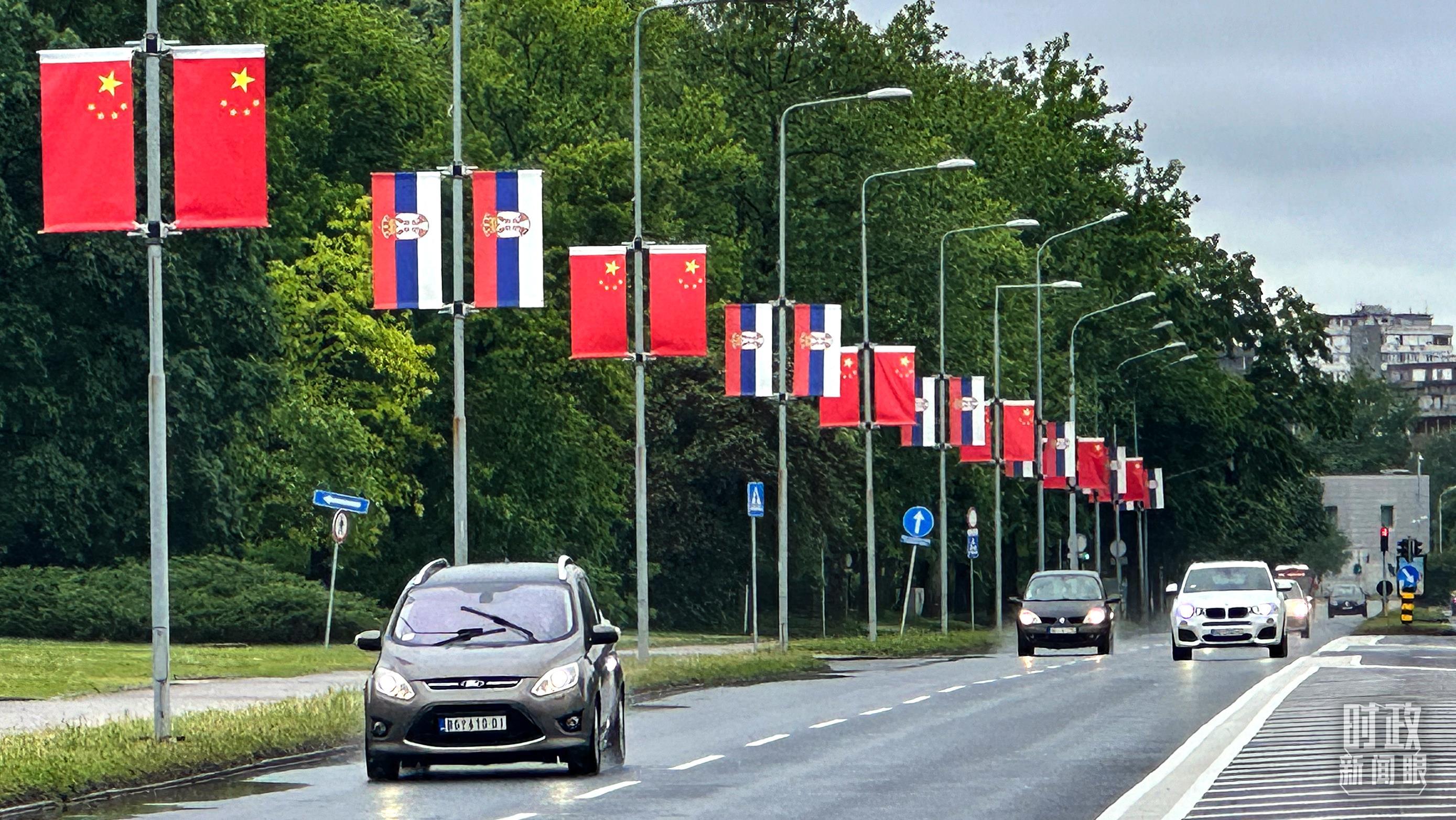△贝尔格莱德的主要街道挂满五星红旗,随风飘扬。(总台央视记者范一鸣拍摄)