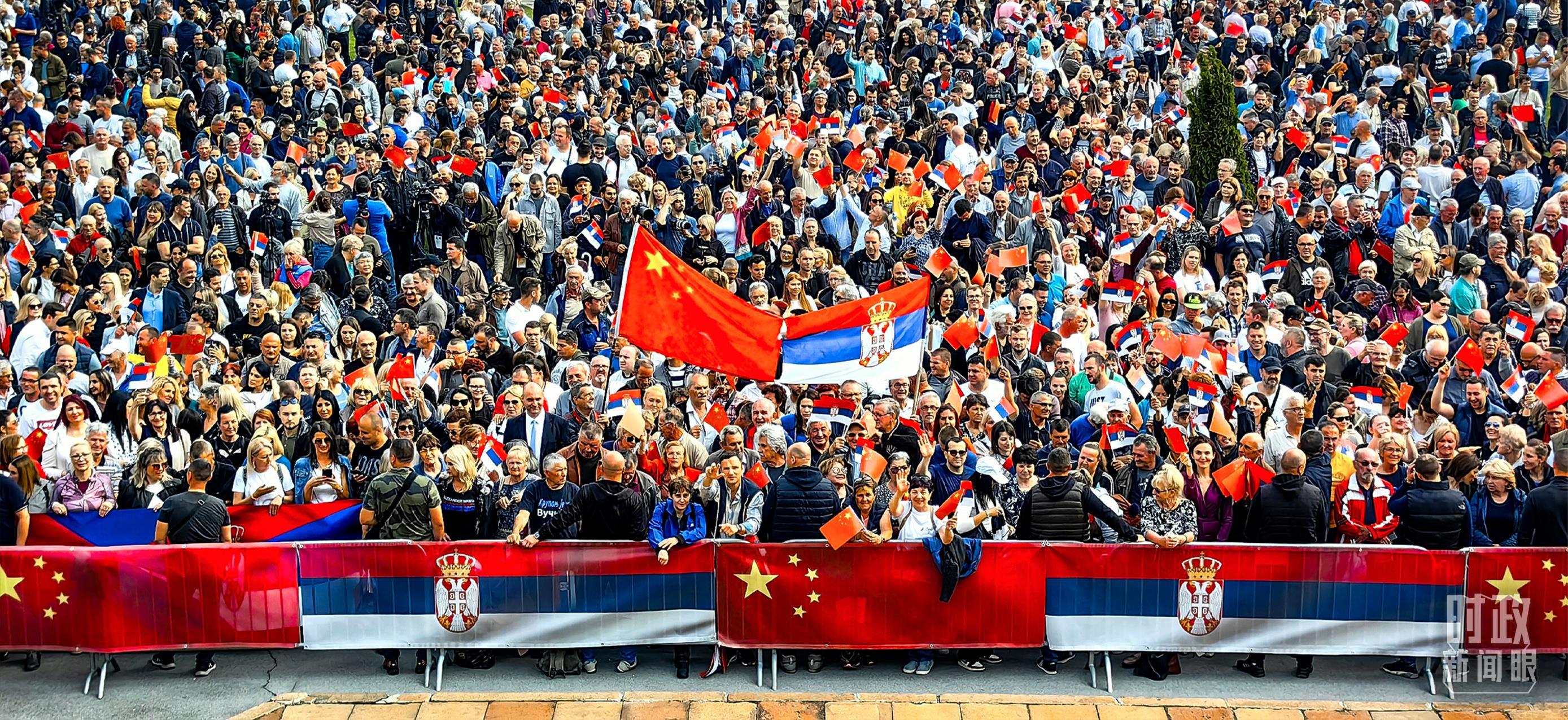 △塞尔维亚大厦广场上,一万五千名塞尔维亚民众挥舞中塞两国国旗,热烈欢迎习主席到访。(总台央视记者段德文拍摄)