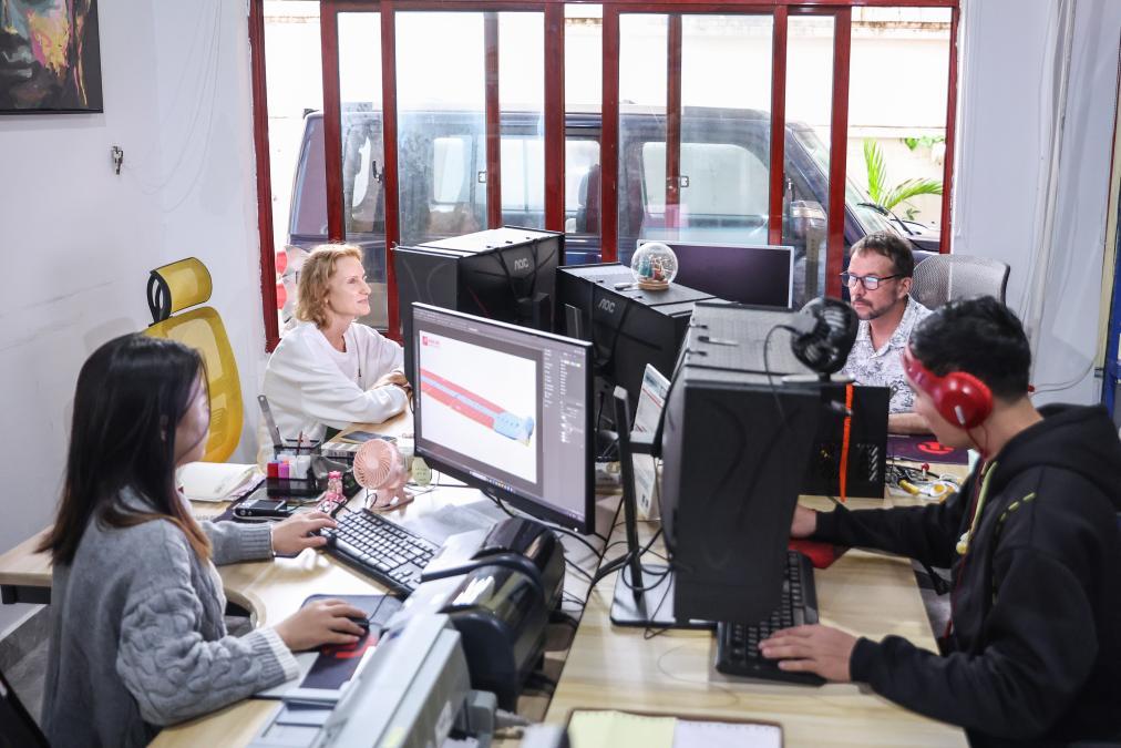 外籍人士和其他员工在位于海南博鳌的冲浪用品店工作(2024年3月7日摄)。新华社记者 张丽芸 摄