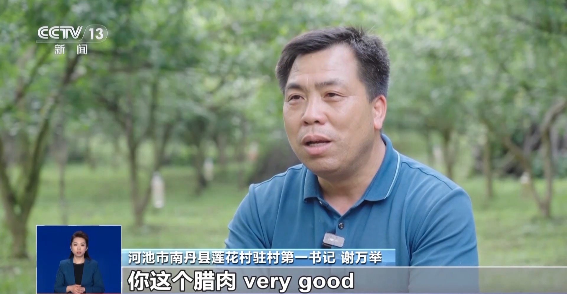 河池市南丹县莲花村驻村第一书记 谢万举:我一讲是来莲花村,又是来为群众工作的,尼克很高兴,说你要和我去驻村,他说没有问题,第二天就去买新被子、新鞋子、新脸盆、新毛巾全部新的,就跟我来了莲花村,一直到现在。有一些群众第一次见外国人,我带他入户的时候,群众很热情的,马上就招待我们。尼克吃完他们的腊肉,和群众说你这个腊肉very good。我们群众马上生气,你怎么讲我这腊肉是苦的,后来我解释very good意思是好的,表扬你的腊肉,群众也开心了。