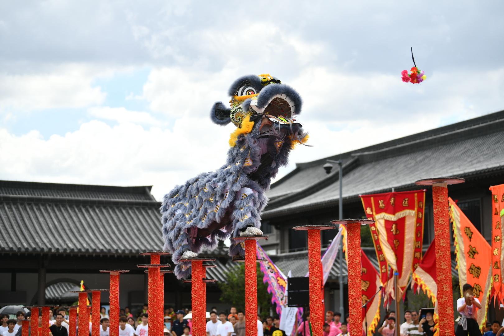 时而腾空跃起、时而低头俯冲、时而转身腾挪、时而“倒挂金钩”……每一个动作都充满了灵气与美感。每当桩上的“雄狮少年”完成一组行云流水般的高难度动作时,现场观赛的市民游客惊叹声此起彼伏,掌声雷动。