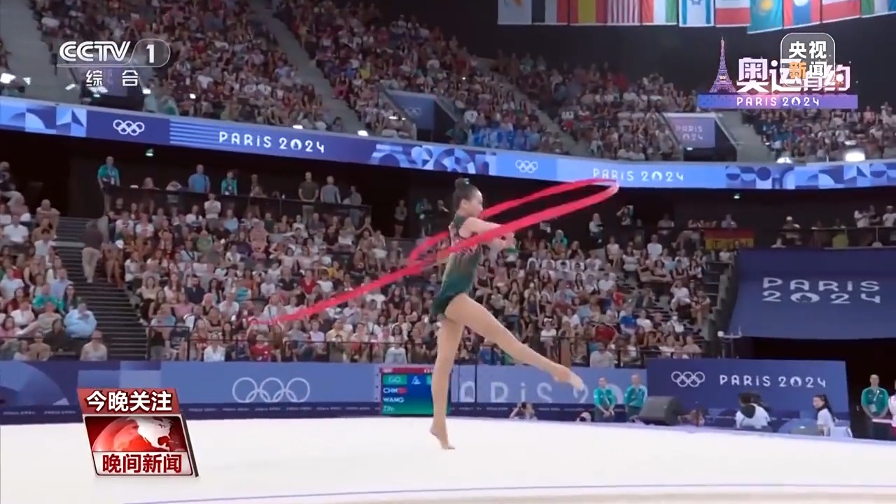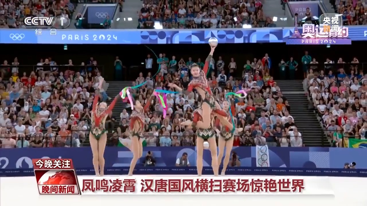 而在艺术体操女子团体全能决赛中,中国艺术体操的姑娘们以总分69.8分,拿下该项目的金牌。在决赛三带两球项目《凤鸣凌霄》表演中,伴随着动听的音乐,姑娘们灵活地运用彩带和球,以精准的动作、极具张力的表演,诠释了汉唐国风的民族美学。