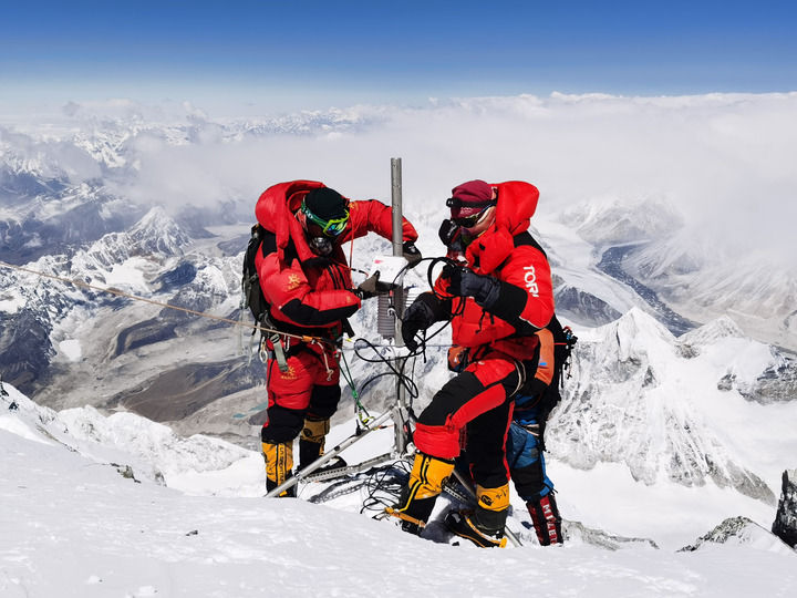 珠峰科考登顶小组队员在架设自动气象站(2022年5月4日摄)。 新华社特约记者 索朗多吉 摄