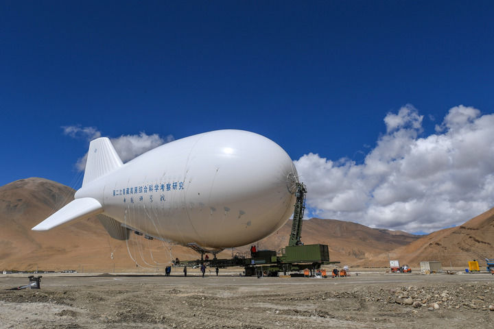 完成充气后的“极目一号”Ⅲ型浮空艇在中科院珠峰站附近等待升空(2022年5月12日摄)。新华社记者 姜帆 摄