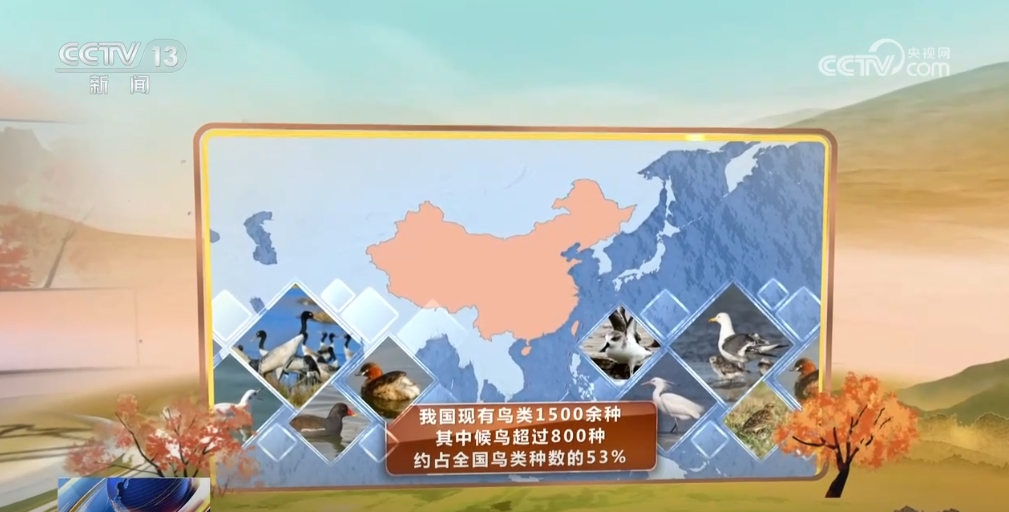 全球9条主要候鸟迁飞通道,其中,4条经过中国,分别为西太平洋迁飞通道、东亚—澳大利西亚迁飞通道、中亚迁飞通道以及西亚—东非迁飞通道。据统计,我国现有鸟类1500余种,其中,候鸟超过800种,约占全国鸟类种数的53%。