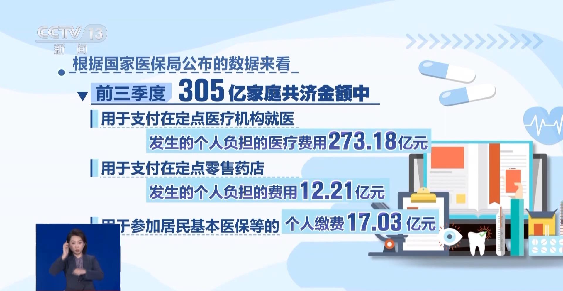 根据国家医保局公布的数据来看,前三季度的305亿家庭共济金额中,用于支付在定点医疗机构就医发生的个人负担的医疗费用273.18亿元,用于支付在定点零售药店发生的个人负担的费用12.21亿元,用于参加居民基本医保等的个人缴费17.03亿元。