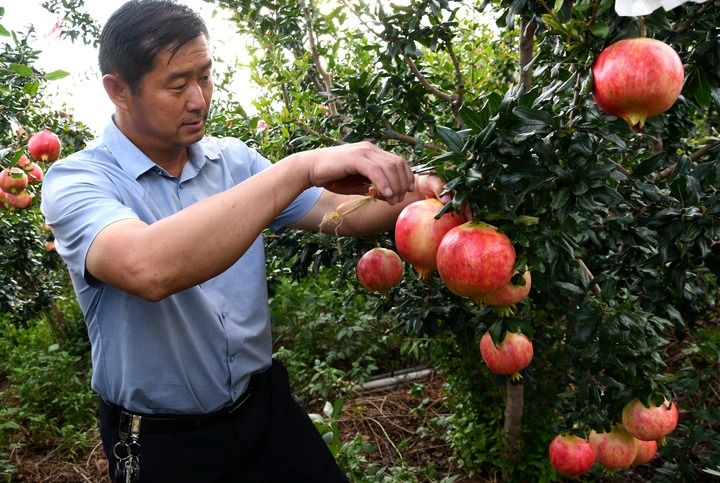 2024年9月10日,在凉山州会东县姜州镇山南村的山南德宇种养家庭农场,罗德宇在采收成熟的石榴。新华社记者 高健钧 摄
