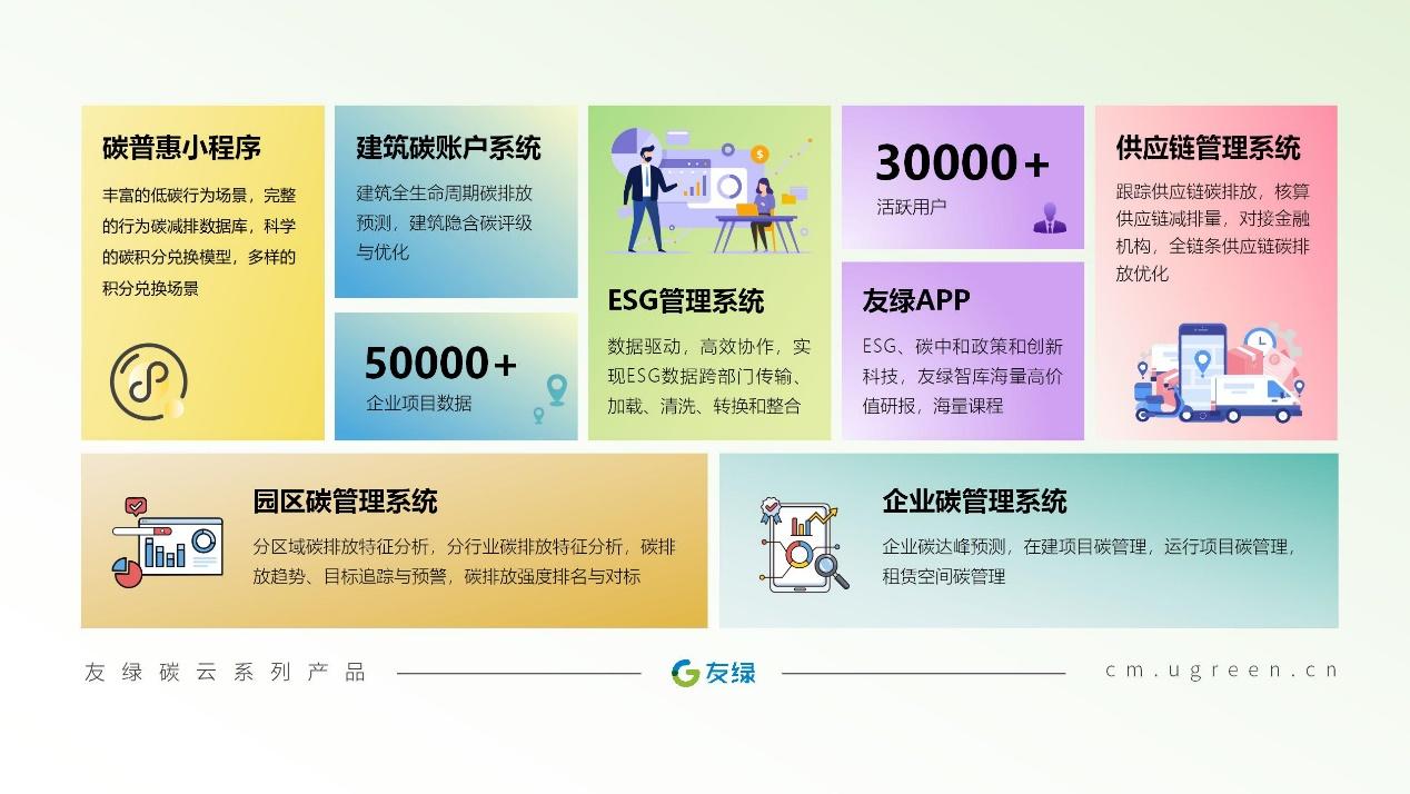 会上,友绿推出了七款数字化碳管理产品,涵盖企业碳管理、园区碳管理、供应链管理、ESG管理、建筑碳账户,碳普惠小程序以及面向个人的双碳学习交流平台友绿app。