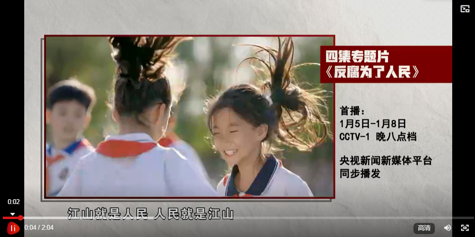 【解说词】江山就是人民、人民就是江山,人民立场是中国共产党的根本政治立场。新时代新征程,全面从严治党永远在路上,党的自我革命永远在路上,必须以党的自我革命引领社会革命,确保党和人民赋予的权力始终用来为人民谋幸福。专题片《反腐 为了人民》展现了纪检监察机关深入贯彻落实党中央决策部署和习近平总书记重要指示批示精神,在全国开展群众身边不正之风和腐败问题集中整治,集中解决一批群众反映强烈的突出问题,深入推进风腐同查同治,持续深化纠治“四风”,紧盯新型腐败和隐性腐败,不断丰富防治的有效办法,深化以案促改、以案促治,着力铲除腐败滋生的土壤和条件的明显成效,生动讲述了纪检监察机关坚持严的基调、严的措施、严的氛围,坚持反腐为民、反腐惠民,不断增强人民群众的获得感、幸福感、安全感,让人民群众切身感受到党中央和习近平总书记的关心关爱就在身边,公平正义就在身边。