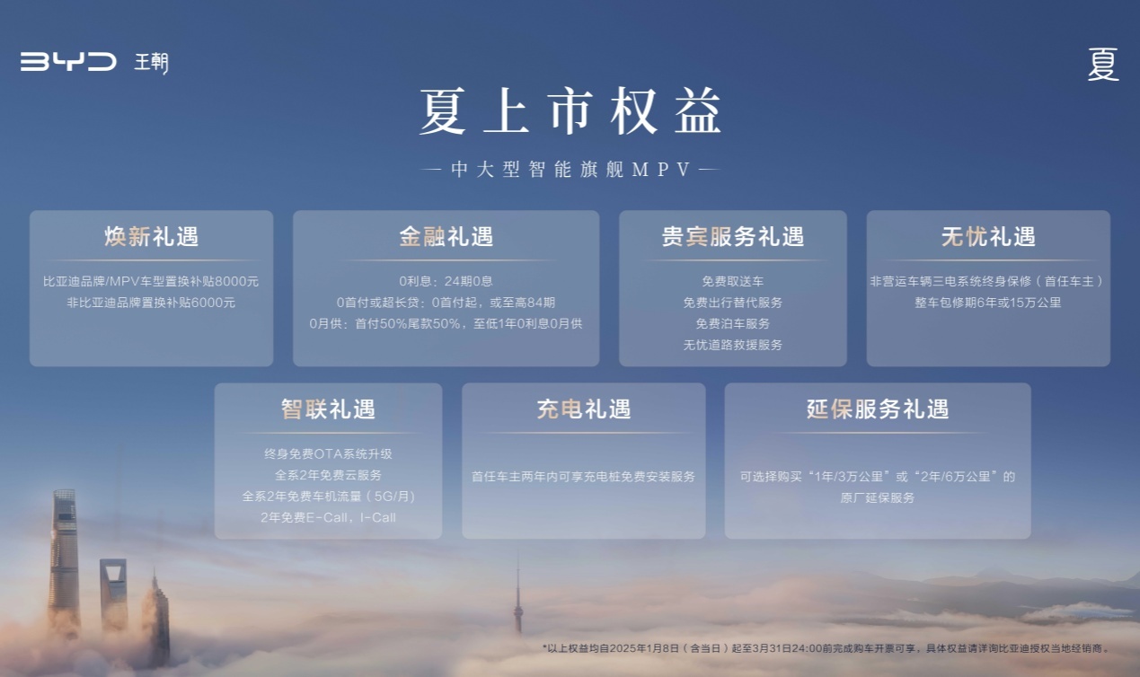 伴随夏的上市,还准备了多重购车礼遇,自上市之日至2025年3月31日24:00前完成购车开票,购买夏可享至高8000元置换补贴、0利息等多重礼遇,进一步降低消费者的购车用车成本,让更多家庭拥有高品质的美好出行。