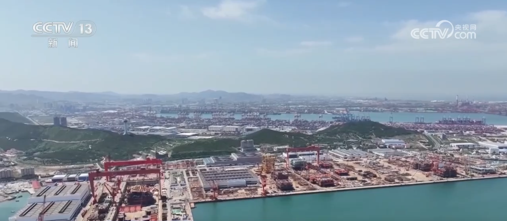 在山东青岛西海岸,多艘大型船舶正在同时建造。一艘21万吨级LNG液化气专用运输船刚出船坞,工人们正在进行码头调试作业。