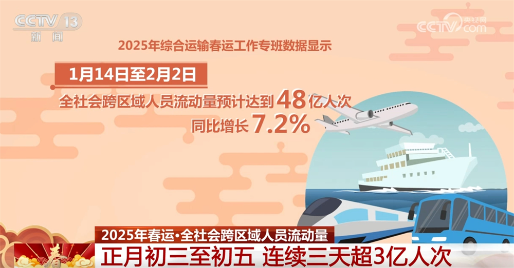 来自2025年综合运输春运工作专班数据显示:1月14日至2月2日,全社会跨区域人员流动量预计达到48亿人次,同比增长7.2%;正月初三、初四、初五已连续三天超3亿人次,均超去年同期水平。