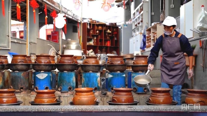 制作盬子鸡的盬子,来自当地省级非物质文化遗产代表性传承人母先才的陶艺馆。2014年,在政府的帮扶下,母先才依托传统技艺开设了陶艺馆。现在,他不仅把原来的土窑改成了更加环保的电窑,还把工坊变为集制陶、研学、餐饮为一体的陶艺馆,受到游客欢迎。