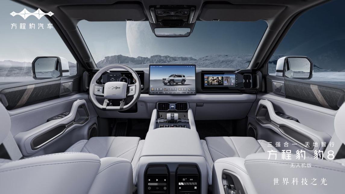 外观上,豹8无人机版在科幻硬派、星舰美学的基础上再度进化。车顶加装了智能机库及4K高清超广角车顶摄像头,科技灰配色结合机甲风的外观设计,更集成、更轻盈,尽显未来智慧科技风范。同时,豹8无人机版新增推出专属限定内饰色——雪峰白,以纯净冰川美学打造专属操控空间,让灵感随海拔攀升,让车内车外都是极致风景,在极简舱境中遇见未来。